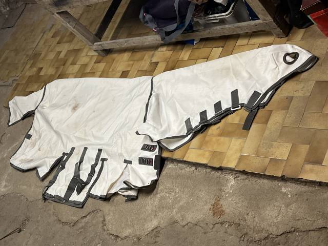 Couverture anti mouche et son couvre cou (fixe) avec trou d'oreilles, taille 145 portée 3 fois par mon cheval, elle a des taches mais aucun accro