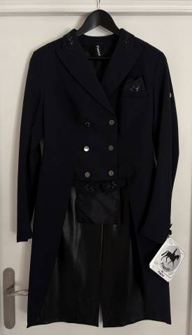 Frac de dressage très chic avec applications de strass. Fabriqué en softshell respirant de haute qualité. Coupe ajustée. Lavable en machine.