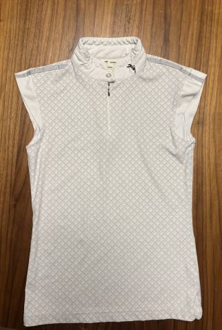 Polo de concours manche courte Pénélope, gris et blanc, avec un imprimer du logo sur toute la surface du polo