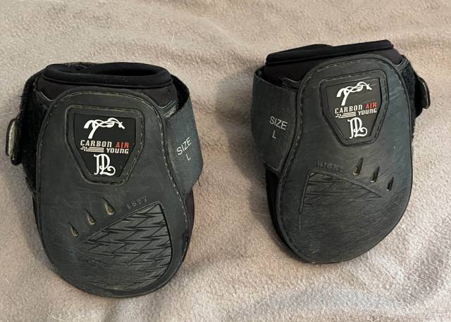 Bon état général - A noter juste un scratch abîmé qui a été recousu (voir dernière photo) et quelques rayures d'usage - Les protèges boulets sont propre, ils ont été lavés.