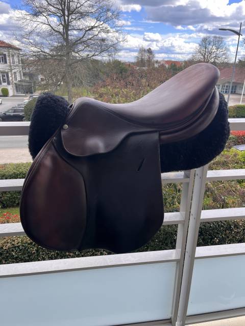Selle Butet taille 17'5, siège plat, quartiers 250, en excellent état. Envoi rapide et soigné. Vendue avec une sangle ergonomique Butet taille 135cm.